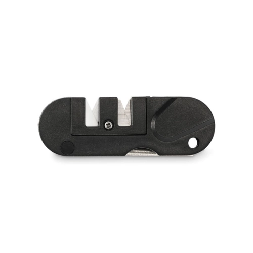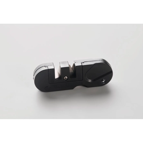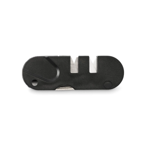 ABS pocket-sized knife sharpener. Includes 1x ceramic blade finishing and polishing, 1x tungsten carbide blade for quick sharpening and repairing severely damaged blades and 1x tapered diamond rod for serrated edges, gouges, and general sharpening.